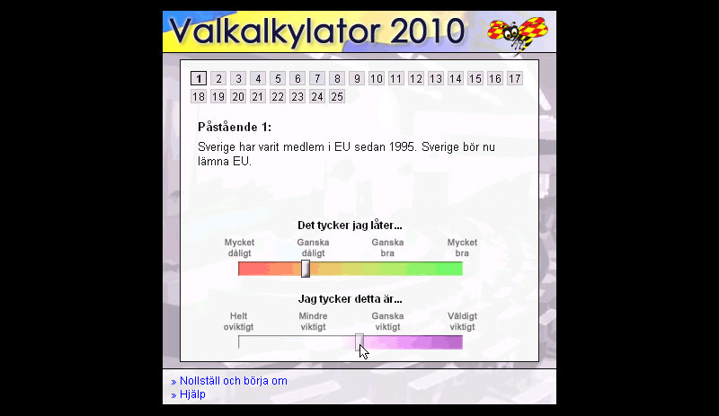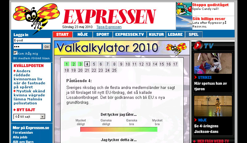 In 2009, the Expressen newspaper hired me to develop a party affiliation test for the Swedish parliamentary election of 2010. Building on the similar app I built for the 2009 EU parliamentary election, I expanded on the weighted scaling of respondents' questions, also adding weights to the official responses from parties. This made it possible for my app to match would-be single-issue voters with their corresponding single-issue parties.