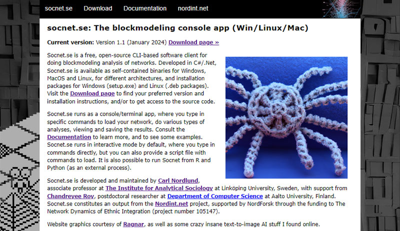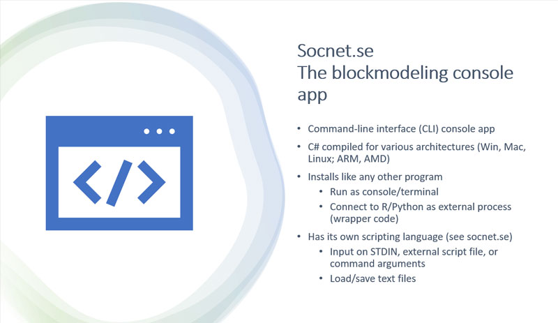 Socnet.se is a free, open-source CLI-based software client for doing blockmodeling analysis of networks. Developed in C#/.Net, Socnet.se is available as source or self-contained ready-to-run binaries for Windows, MacOS and Linux. Run either as a stand-alone application or as an external process from R or Python, Socnet.se implements all common forms of node equivalence, ideal blocks, and several search algorithms and goodness-of-fit functions.