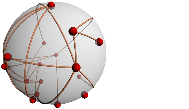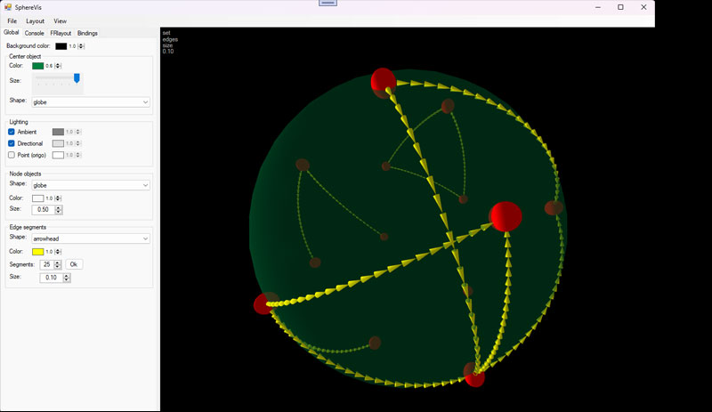 C# client using WPF for force-directed visualization of networks in 2-dimensional closed space, i.e. on the surface of a sphere. The client software offers several ways to customize the visuals and bind valued ties and actor attributes to the size of graphical objects. The client software implements a Fruchterman-Reingold force-layout algorithm where euclidean distances are replaced with great circle distances: the purpose of the client being to experiment whether close-space visualizations can yield better goodness-of-fits (such as Kruskal stress indices) compared to the traditional open-space visualizers.