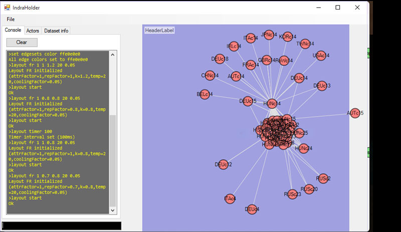 Written in C#/WPF, Indra is a custom UserControl for doing advanced network visualization. Although provided with a WinForms wrapper, Indra is meant to be used as a plugin for other clients for easy visualization of relational data. Rather than working directly with graphical objects and layouts in the host client, Indra uses its own scripting language to create the visualization.