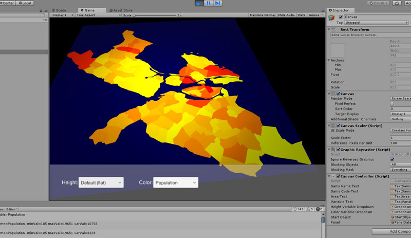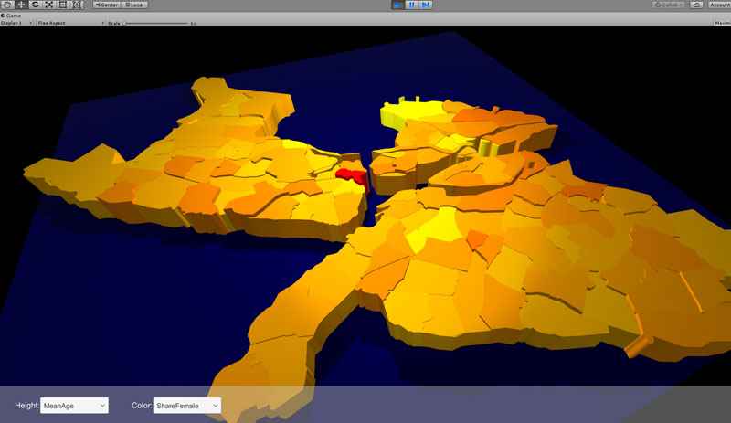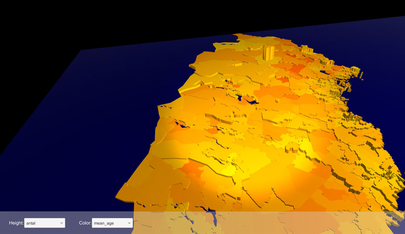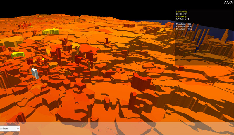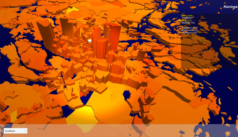 Sams3dViewer is a client for visual analytics of bivariate geographical data developed in C#/Unity. Given a csv input file with geographical data for various variables, Sams3dViewer generates a high-resolution interactive scene where the height and color of the individual 3D meshes can be linked to any two variables. Full visual interaction is provided either by using a mouse or through a touch screen, where individual geographical entities can be examined. Sams3dViewer works in tandem with the Shapefile3dReader client that converts original shapefile files into suitable 3D meshes (such as the typical SAMS regions in Swedish geographical statistics). Sams3dViewer is developed within the Nordint.net research project.