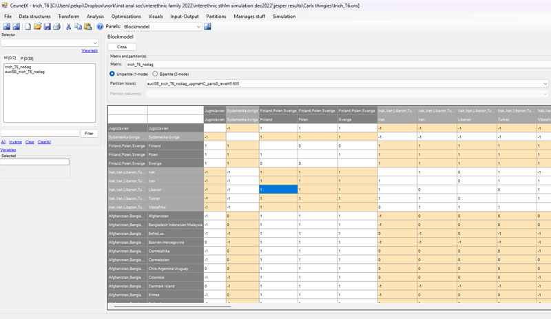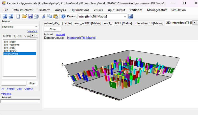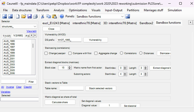 Ceunet is my own personal sandboxing client for various network-analytical tasks, whether for doing various analyses or testing novel network methods and metrics. Built in C#, Ceunet uses my own text-based '.cns' file format for storing various data types - matrices, edgelists, vectors, partitions, actorsets etc - but it also has import/export functions for Gephi, Ucinet, Pajek etc. Ceunet implements a lot of functionality for Input-Output analysis (including my fingerprinting methods) as well as several heuristics for agglomerative hierarchical clustering and related adequacy metrics.
