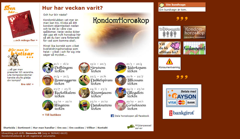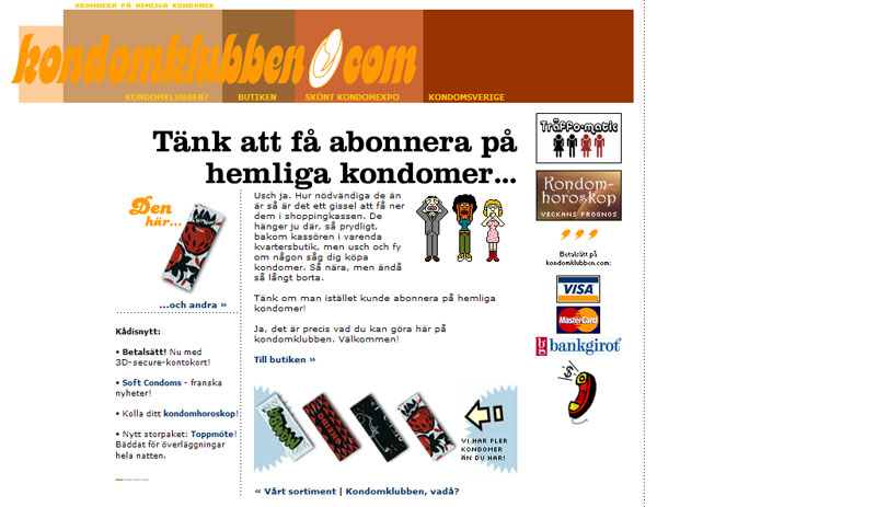 Kondomklubben.com was one of the first online condom stores in Sweden when launched in 2001. Apart from standard deliveries, Kondomklubben offered fully tailorized subscriptions: four of these, two of that, with ten deliveries every 3rd week. I developed/coded everything from scratch (PHP/MySQL), including integration with external card payment service, and with a custom-made e-commerce system integrated with a C# client for automatic printing of delivery labels. Graphics design and layout provided by a good friend of mine though (as I suck at that).